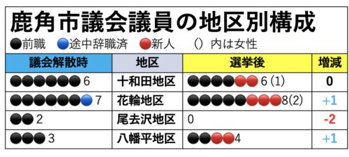3月9日に投開票された、鹿角市議会議員選挙の結果について、選挙前後での地区別の議員数構成を表にしてみました。 尾去沢は−2となり、出身議員が0になりました。 花輪と八幡平では、それぞれ+1となりました。 八幡平地区に関しては、唯一、立候補者全…