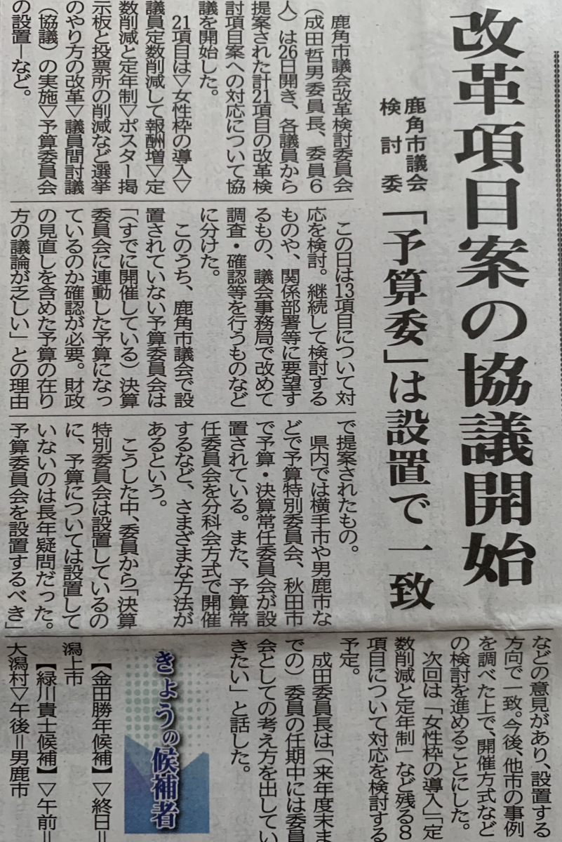 10月26日の10時から議会改革検討委員会が開催されました。私は委員ではないですが傍聴させていただきました。概要については、下記の北鹿新聞を参照ください。また、過去の関連記事に関してはこちらを参照ください。